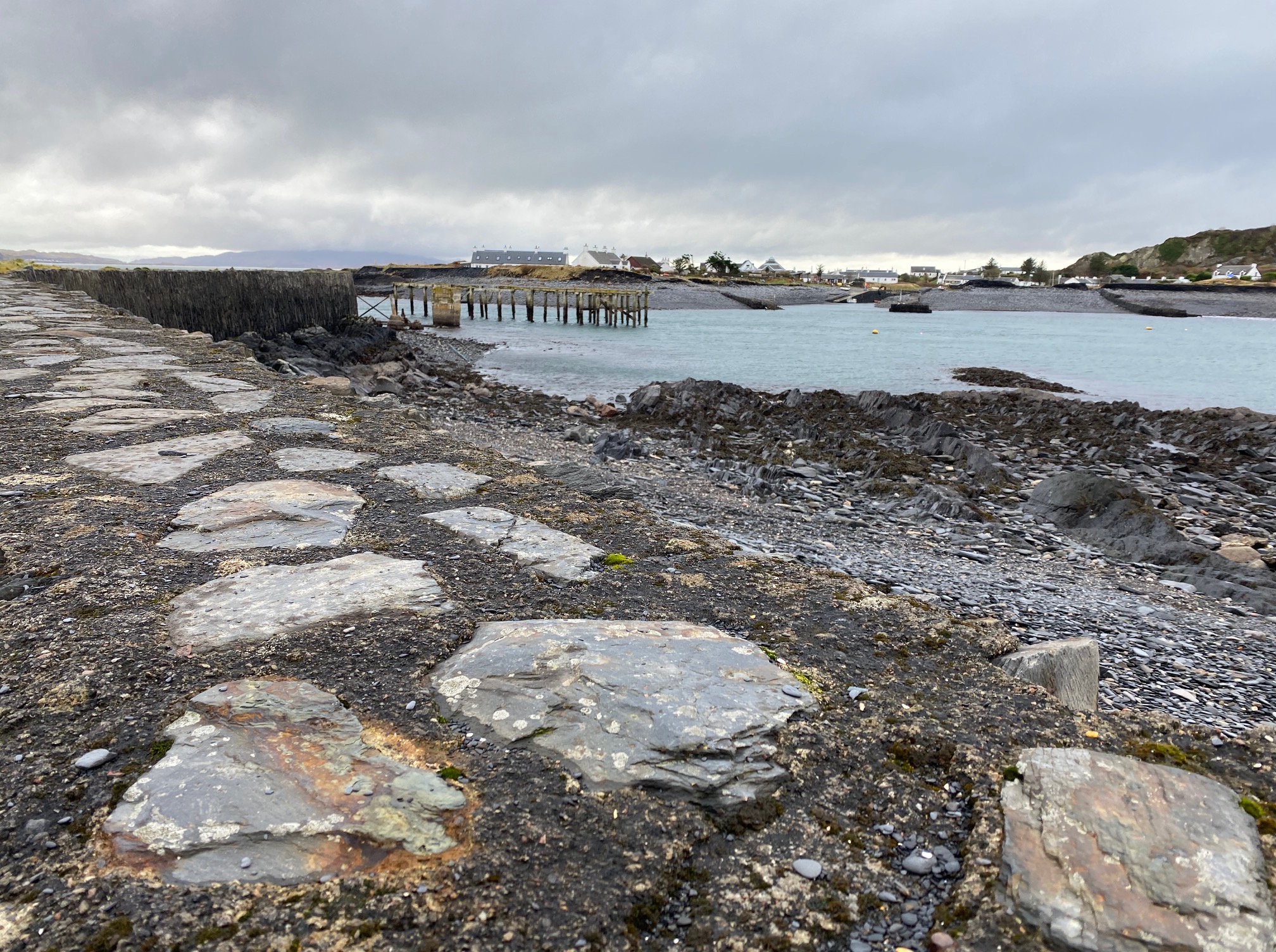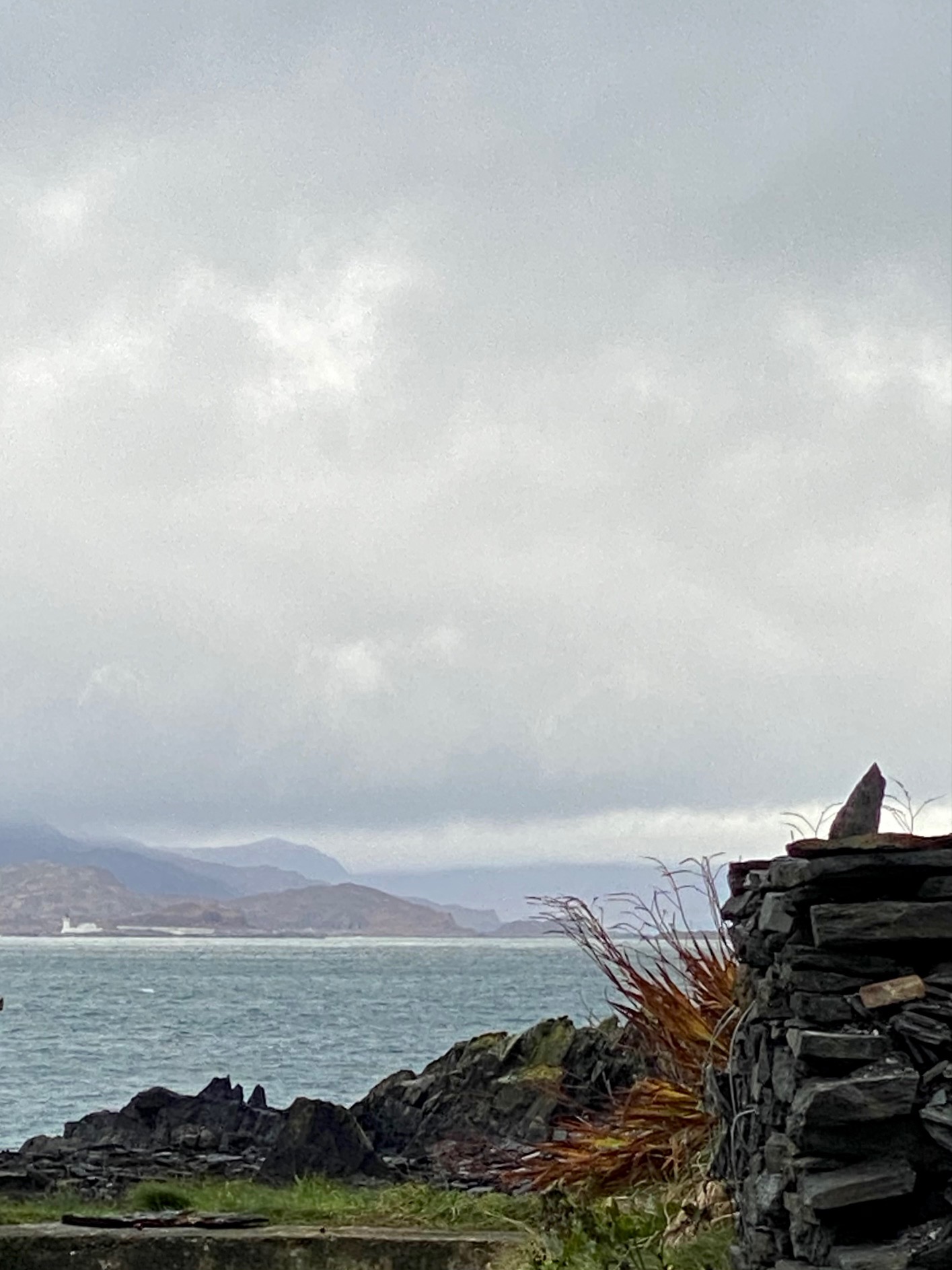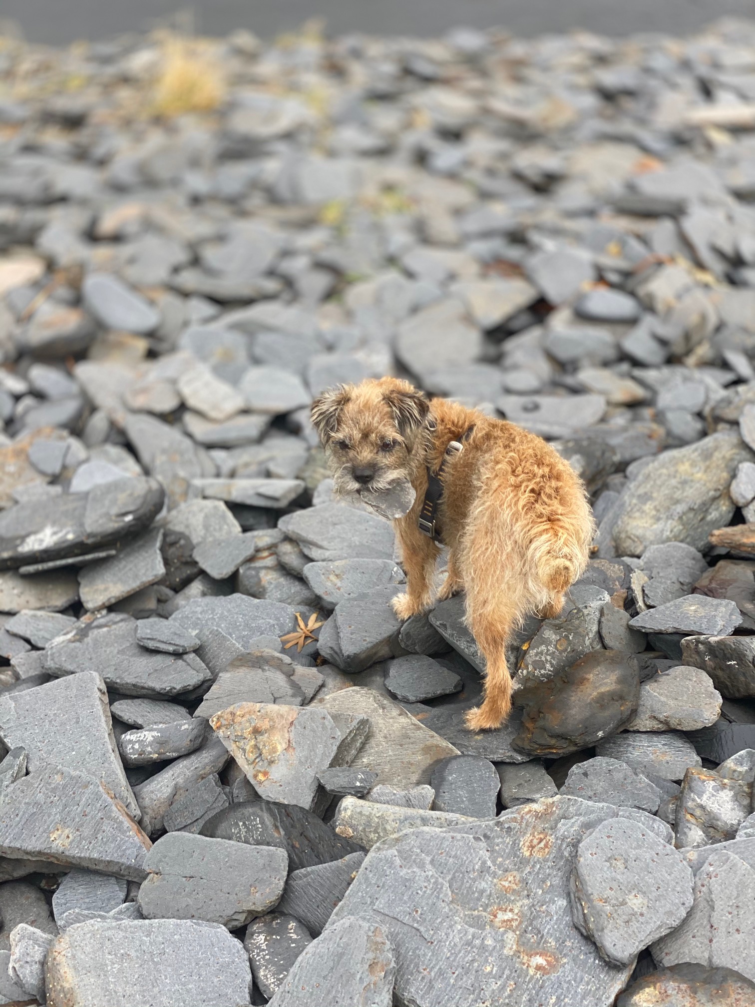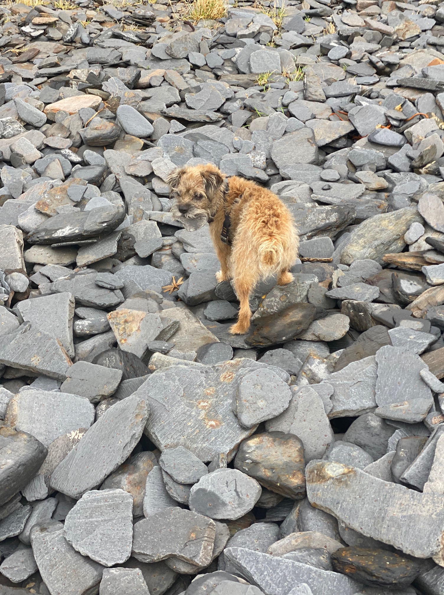 Part of the walk along a slate dyke has become much rougher since Storm Aiden a few weeks ago. But this is DogS’s favourite bit.