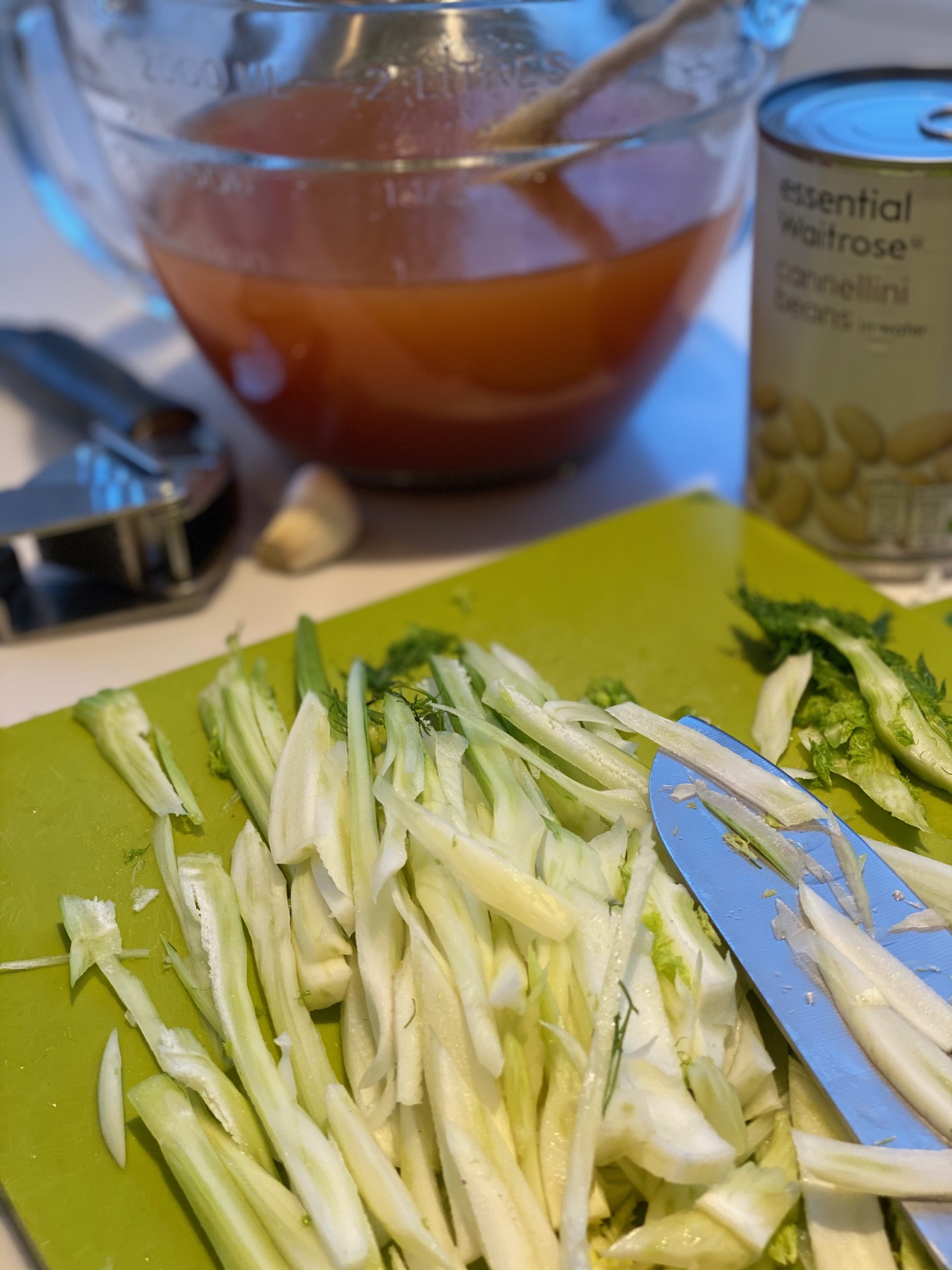 Luckily yesterday was shopping day. So with a newly purchased fennel I was good to go. Well apart from having to substitute white for red onion, using tomato puree diluted with stock from the weekend chicken not tomato juice, and cannellini rather than butter beans.