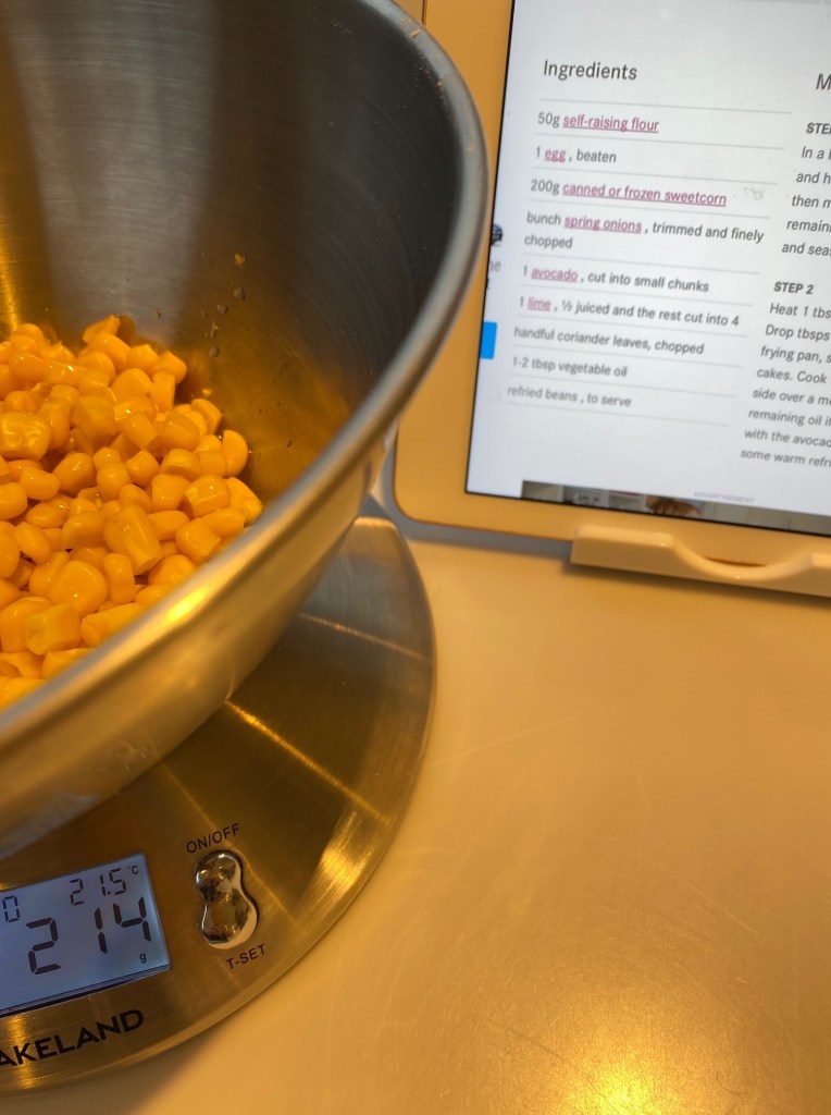 I could make some…I mean I’ve made tortillas, but never tortilla chips. So instead I’ve decided on corncakes, which is great as there’s some leftover sweetcorn in the fridge.