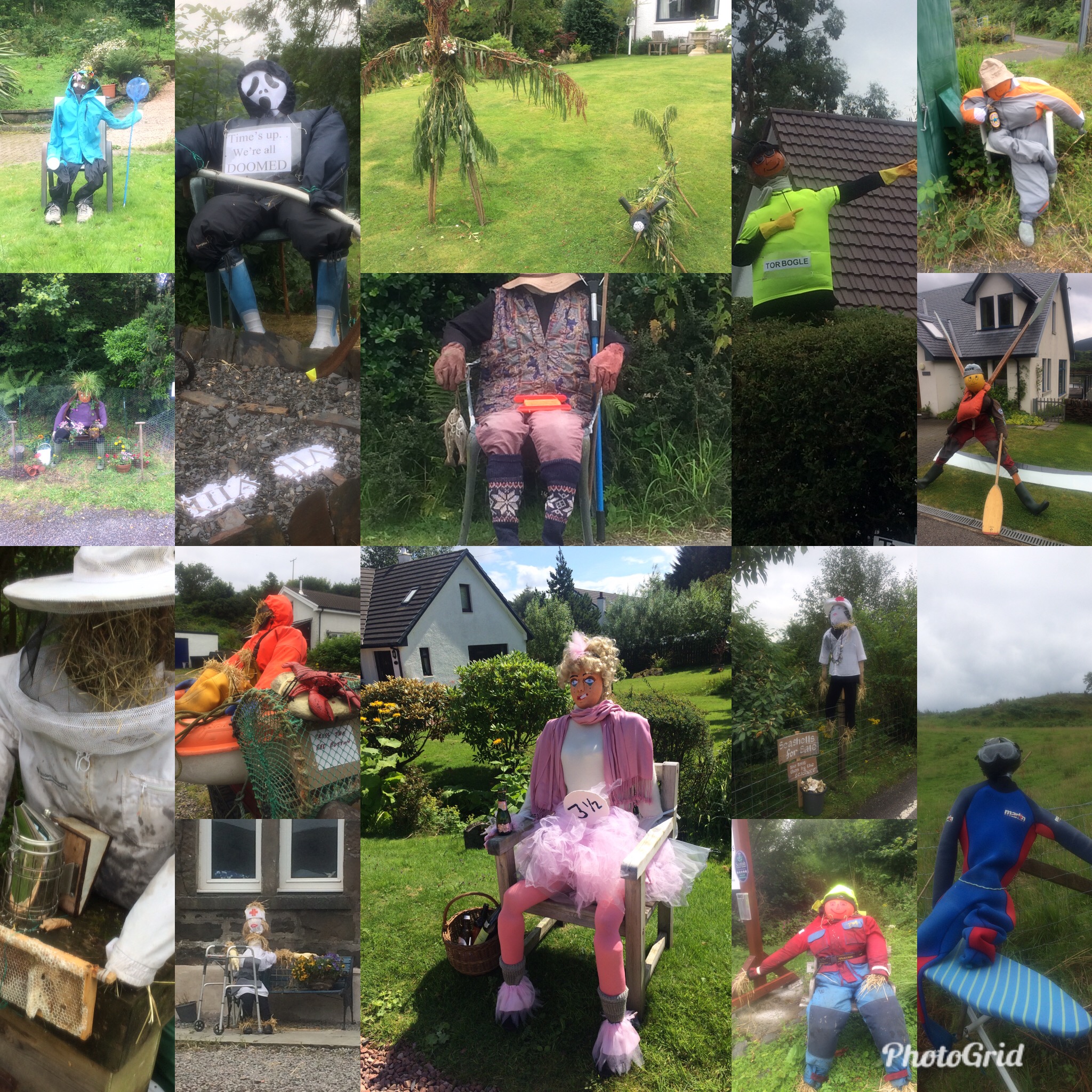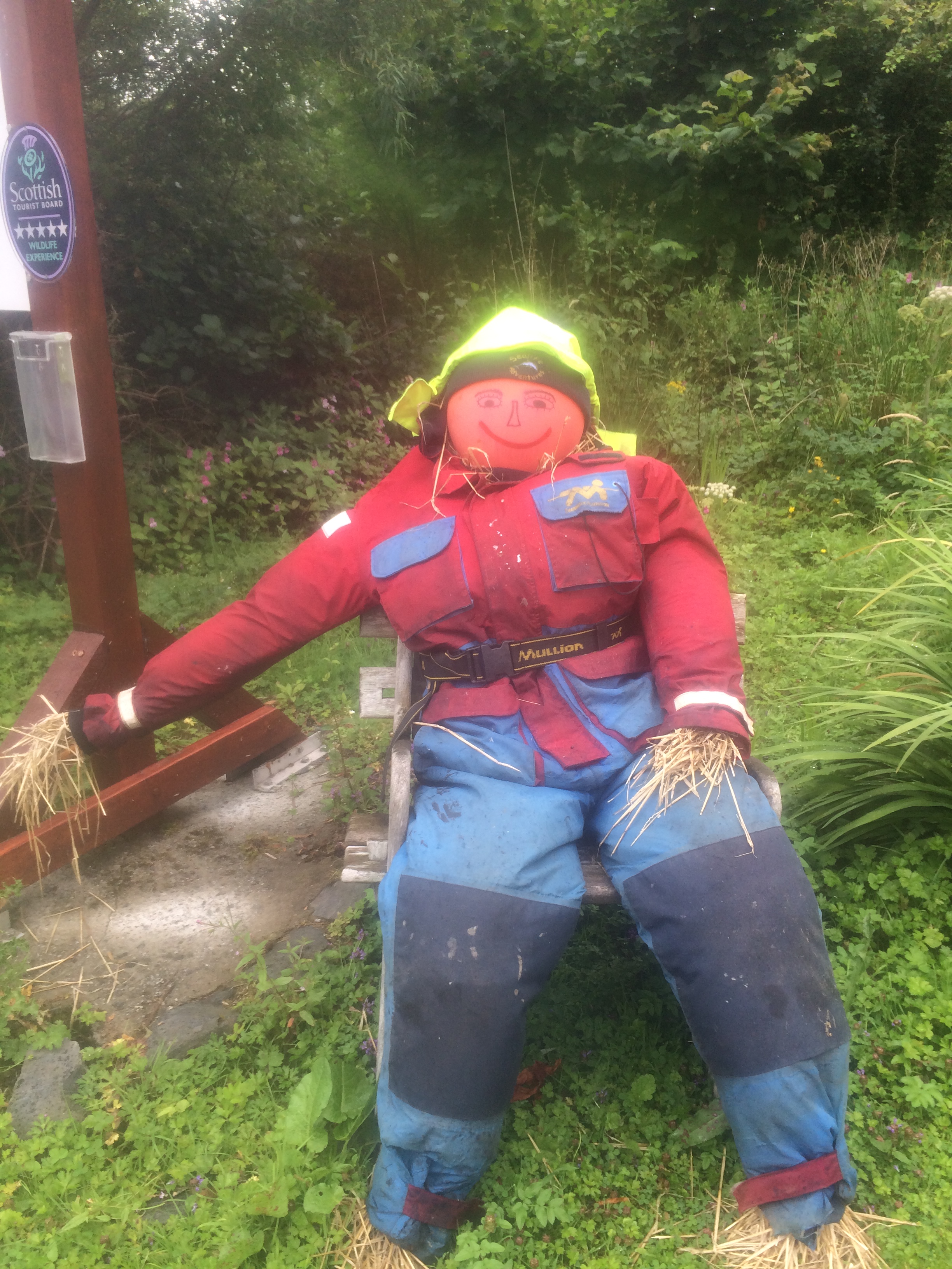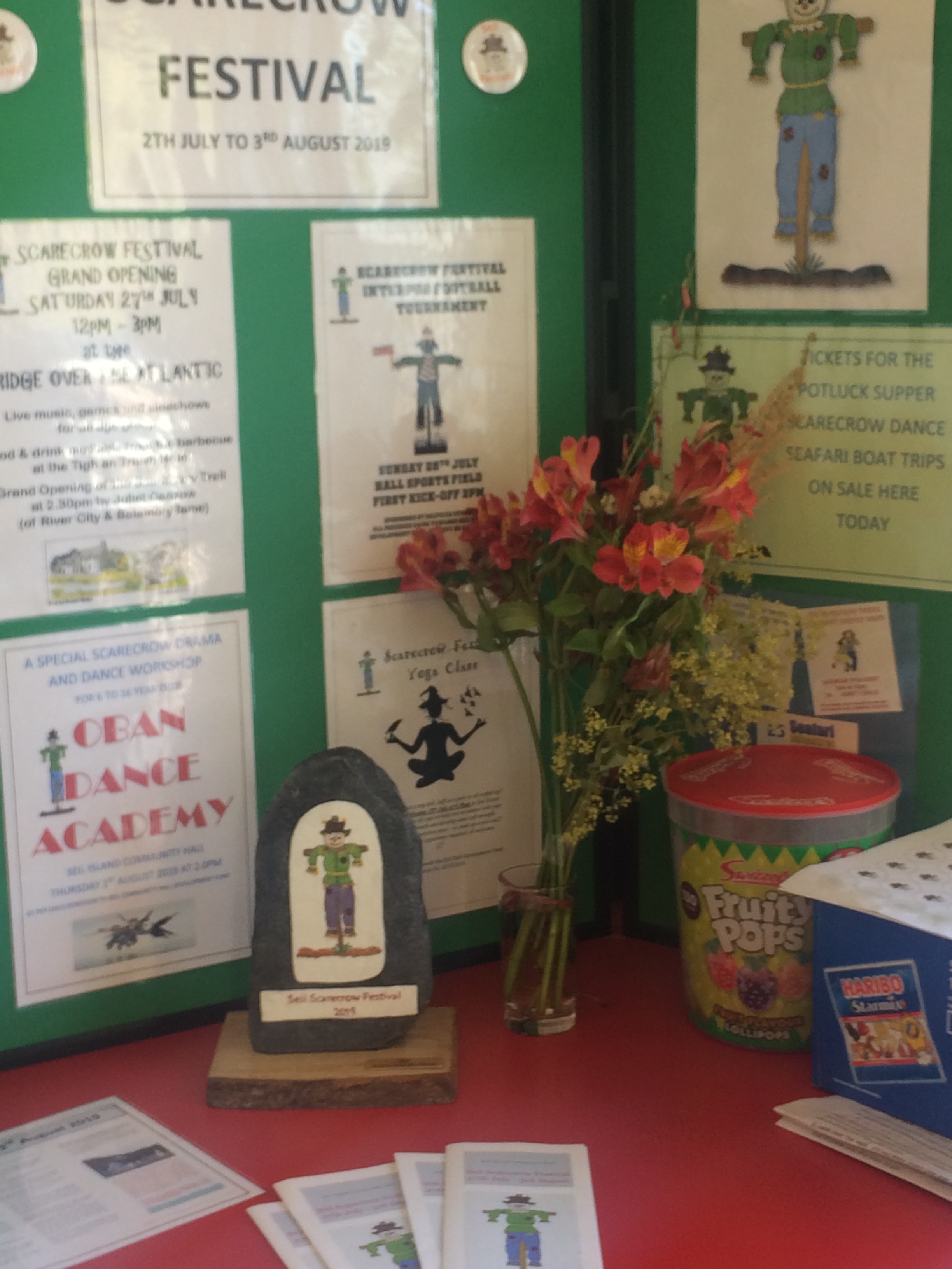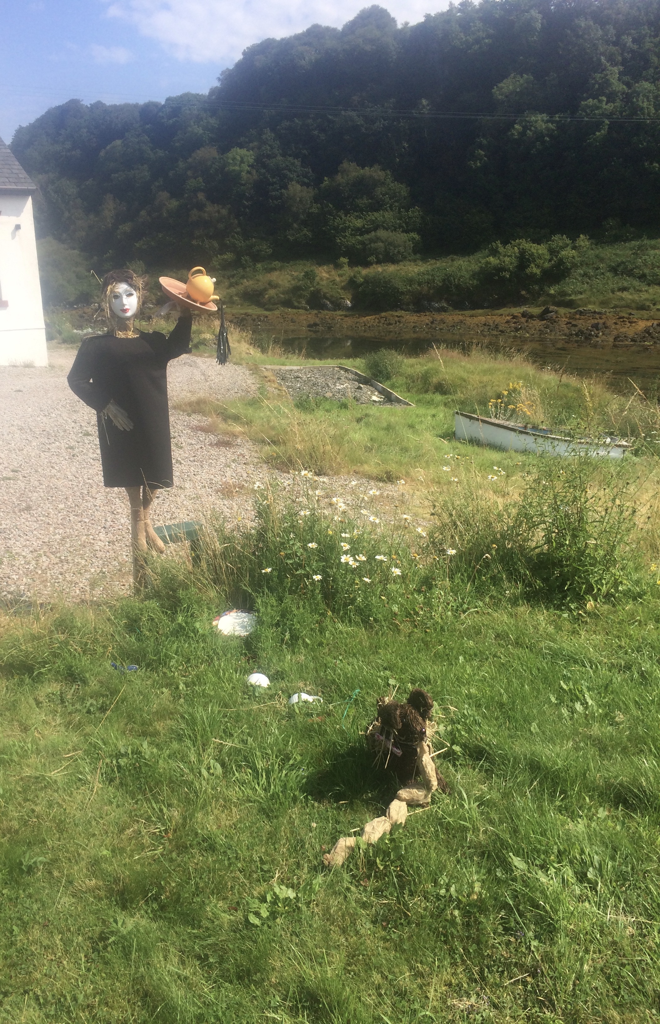 Last year we held a Scarecrow Festival, to raise funds for our island hall. And on the day of its grand opening, a Saturday in mid July, it was cold, grey and wet. Luckily there were plenty of umbrellas on hand to shelter our guest of honour on her ribbon cutting duties.